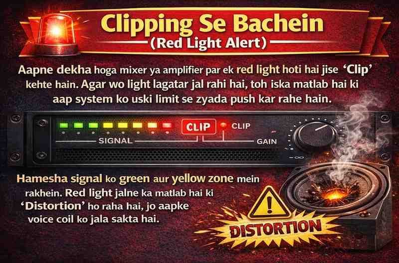 Aapne dekha hoga mixer ya amplifier par ek red light hoti hai jise “Clip” kehte hain. Agar wo light lagatar jal rahi hai, toh iska matlab hai ki aap system ko uski limit se zyada push kar rahe hain.