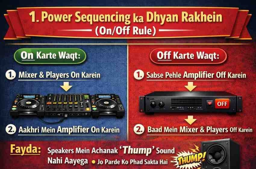 On karte waqt: Sabse pehle apne mixer aur players on karein, aur sabse aakhri mein Amplifier on karein.