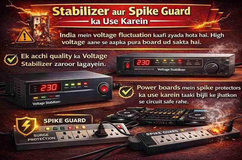 Power boards mein spike protectors ka use karein taaki bijli ke jhatkon se circuit safe rahe.